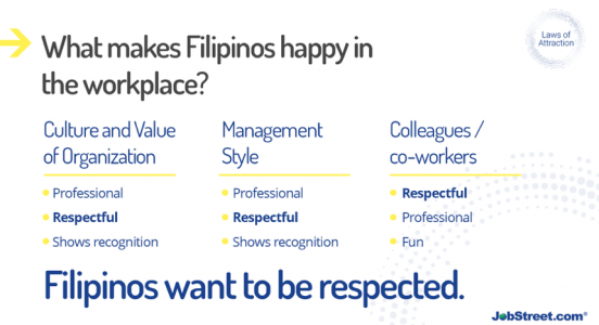 This is the final installment of my 3 part blog series about Jobstreets’ new resource, laws of attraction. Today, I will close the series by discussing what can make Filipinos happy employees.